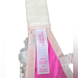 Romantic, flirty, and oh-so-pretty—this Victoria’s Secret Body by Victoria bra features soft pink mesh with ivory lace overlay and a sweet bow detail at the center. It’s a demi style with underwire support, perfect for a barely-there feel with just the right amount of lift. Size 34D.