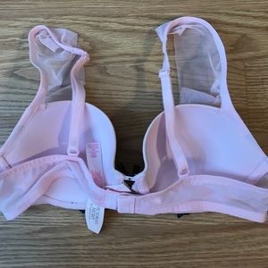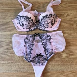 Victoria's Secret Bra and Panty set. Demi cut bra. No push-up. Soft cups.Never been worn but has been tried on. If you don't want the panties because you think that's weird, I'll just send the bra. Soft baby pink chiffon with black floral stitching. Soft lined cups and chiffon covered adjustable straps. Panties are size Med, high waisted thongs and have REMOVABLE fluff on back. I love this set, but I'll never wear it. Set together was $89. Panties have no tag bc I hand washed when I got them
