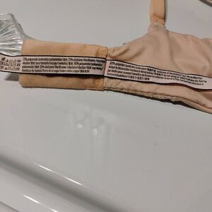 Lightly Lined Perfect Coverage Convertible Bra from the Body by Victoria line. Very pretty peaches and cream color with crochet ish lace and ribbon details on the sides of the cups and near the back 2 hook closure. Really soft, smooth and comfortable bra with great support that adapts to most of your bra wearing needs. Can be worn as a regular bra fit or crossed in the back as a racer back style. Or, crossed in the front for blouses or dresses with many types of open back / low back styles. The color is about halfway between the lighter photos and the darker photos. It is a pleasant mix of cream and peach. This bra has had very minimal use and is in excellent pre owned condition with no flaws.