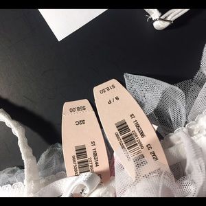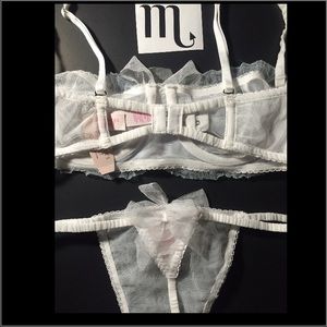 Brand-new with original tags Victoria's Secret bra with matching panty set. Bra is unlined and can be worn with or without straps. Panties are Vstring. Set is white with white iridescent netting. And white bows. Super fun, super cute set! 36B comes with Medium panties. All other sizes come with Small panties.