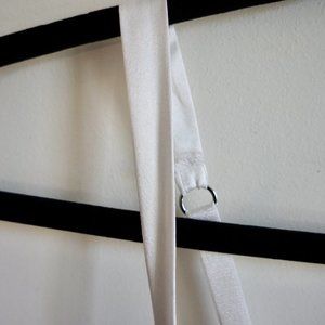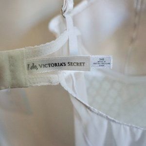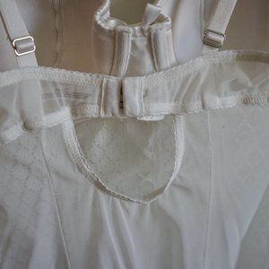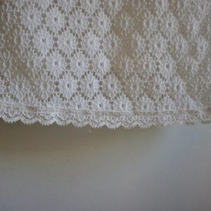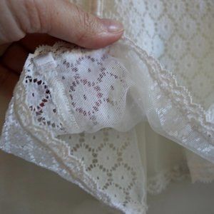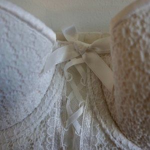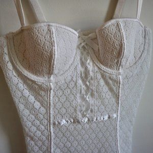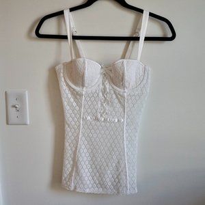 Gorgeous white lace bustier top with mesh back. Padded cups, bra clasp, satin adjustable straps. Pair with wide leg jeans and slingback heels for a casual bachelorette look.
