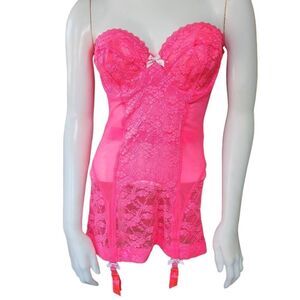 Victoria's Secret bright pink lace and mesh strapless babydoll with underwire and garter snaps.