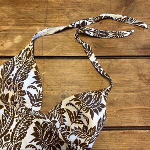 Victoria’s Secret tankini swimsuit top. Size small. White with brown floral paisley pattern. Tie halter style. Light cup padding.