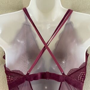 Victoria’s Secret women’s lingerie Bodysuit in Burgundy with plunging neckline, lace, and mesh. Adjustable crisscross straps. Sheer panels at the side and back.