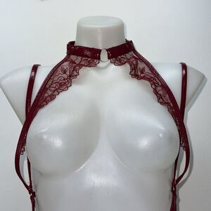 Gorgeous and dramatic Victoria’s Secret strappy lace teddy in a deep burgundy/wine shade. Sexy high-neck design with floral lace, sheer mesh, and adjustable strappy detailing throughout. A bold statement piece perfect for special occasions or photoshoots.