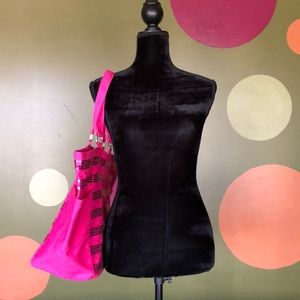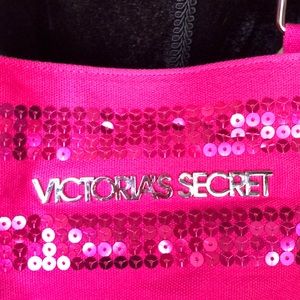 Victoria’s Secret canvass tote with sequins and large outside pockets on each side; color is pink; logo is metal; super cute; gently used; smoke free home