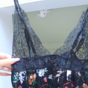 A Victoria's Secret Satin and Chantilly Lace Black Floral Print Babydoll, size S. Open front and luxurious chantilly lace make this a great look.