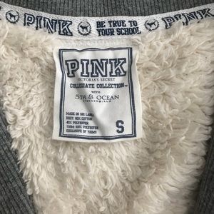 PINK Victoria’s Secret Collegiate Collection with 5th and Ocean Clothing, LLC - Indiana University Letterman-type blazer. Very warm and very comfortable. The Body is 60% cotton and 40% polyester and the trim is 100% polyester. The inside of the blazer is pictured for reference, the sleeves do not have the fur-like material but they are thick. Small hole on back is pictured and is reflected in the price. Don’t judge the picture of me in the blazer it was high school 😝😅