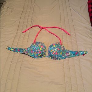 Bright Victoria's Secret bikini top with a mix of blue, pink, and yellow. Ideal for beach fun.