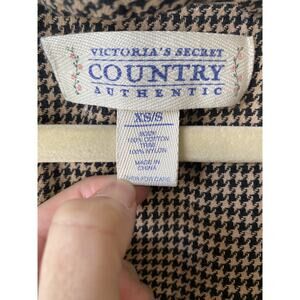 Victorias Secret Country Robe XS/S Vintage 90's Brown Houndstooth Classic Cozy & Preppy. Has pockets. There are multiple flaws. There are a few bleach spots on the beige neckline, a hole on the front bottom of the robe and the black trim lining is piling.