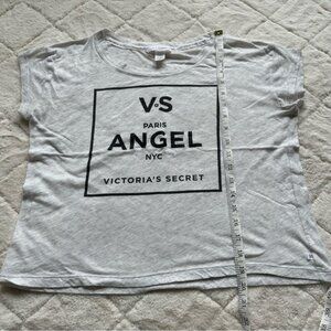 Details: This short sleeve tee is super relaxed, black graphics have a slight glitter look to them. Front says "VS Paris ANGEL NYC Victoria's Secret" on it in black box lettering to mimic a Chanel bottle. This was from the 2013 show and is rare, hard to find. Sits a bit high on me, see measurements for where it falls.