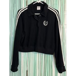 This Victoria's Secret cropped black collared pullover with white stripes and a crest design is a stylish activewear piece perfect for women. The pullover features a comfortable regular fit with a collared neckline, making it a versatile option for various occasions. The black and white striped pattern adds a classic touch to the pullover, making it a fashionable choice for those looking for a chic and comfortable sweatshirt.