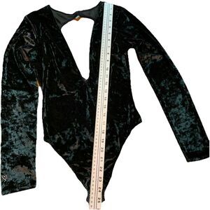 Beautiful velvet bodysuit top from Victorias Secret. The color is black. The size is Extra Small/Small. Deep plunge front and low scoop back. Thong bottom. Very clean, laundered and ready to wear with your favorite pants, skirts and shorts. Condition is very good, preowned condition.