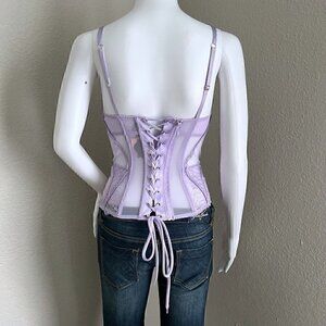 Light lilac purple sheer panel corset with zip back as well as the corset lace up back. It has underwire and adjustable straps. Very sexy.
