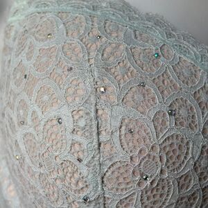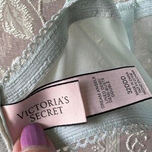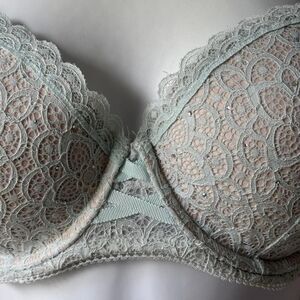 Such a pretty Victoria's Secret Dream Angels mint green lace Demi bra with small rhinestones over cups. Inner cups are flesh tone. Two hooks, four positions. Year 2016 Excellent condition!