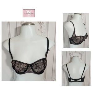 Victoria's Secret structured balconette that accentuates where it matters in lush floral & velvet polka dot mesh. Features unlined lace with outer layer black lace and inner layer pale pink for multidimensional look. Elastic on back. Sheer. Adjustable back and shoulder straps. Gold hardware, and balconette style. Bra is in excellent pre-owned condition. Reasonable offers welcome.