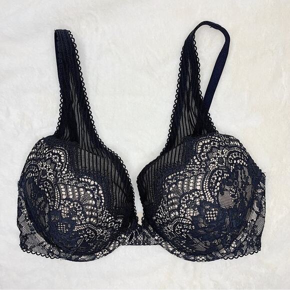 Victoria's Secret Dream Angels Black Nude Lace Pinstripe Push-Up Bra Size 34DD