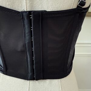 Victoria’s Secret dream angels, black velvet and lace corset style top. Adjustable straps and eight hook closure in the back. Tag size large. Laying flat measures approximately 14 inches shoulder to him as the straps are set and 14 inches armpit to armpit but the underwire cups give a lot of flexibility to the cup size. A fair amount of stretch through the torso. Retailed for $99. Sexy vampire witch Halloween club Las Vegas goth