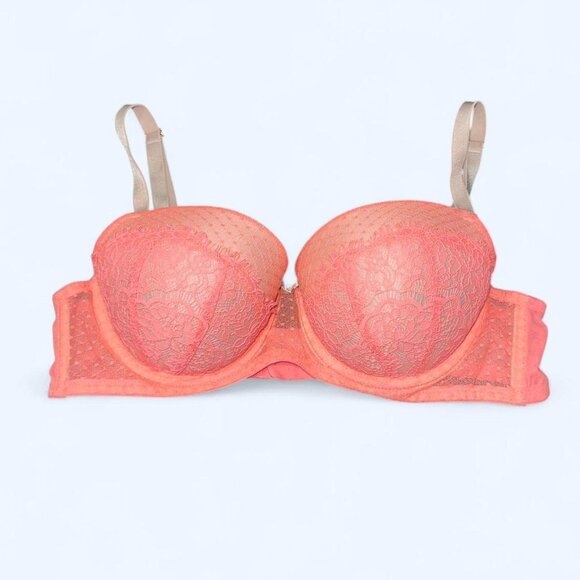 Beautiful coral pink lace demi bra with light padding and underwire support.