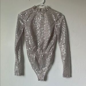 Features: Lace detail throughout, snap closure at gusset, soft shimmer finish, sheer mesh accents, flattering one-piece silhouette