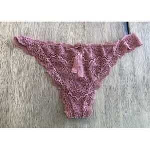 This thong features a barely-there low-rise style. It has scalloped trim along the waist and legs. It has a center bow accent and a cotton-panel gusset. Thong style. The color is Dusk Mauve, which is a lovely pink shade. New with tags.