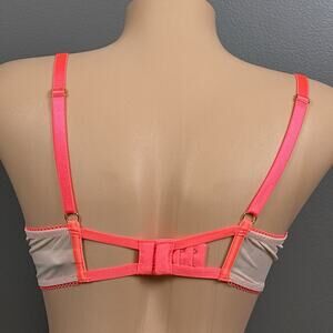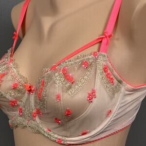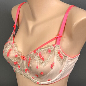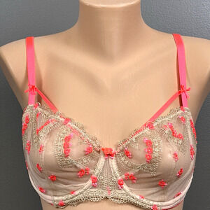 Listed is a Victoria’s Secret Dream Angels Push Up without Padding Bra, beige nude mesh with neon floral embroidery, neon strap, back closure, adjustable strap. Style 124711. Mostly sheer with a sling style partial at the bottom of cup.