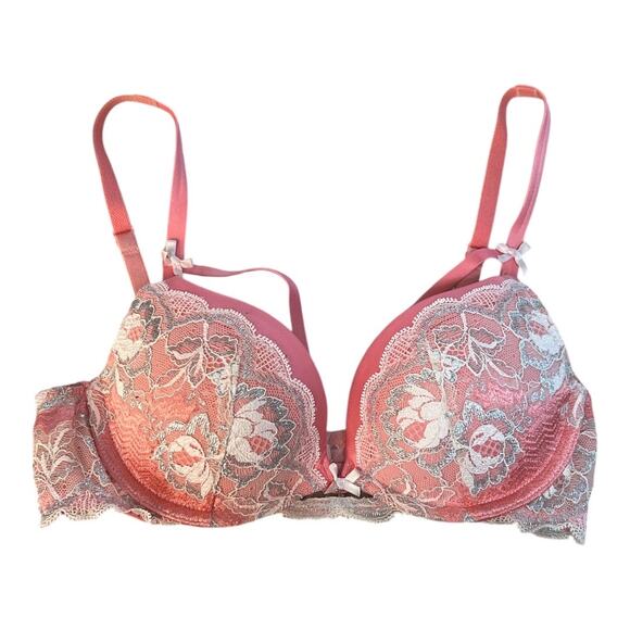 Victoria’s Secret Dream Angels Push-Up Bra in a gorgeous pink/coral tone with floral lace overlay and subtle metallic shimmer. Supportive underwire with push-up padding for lift and shape. Feminine bow details and adjustable straps.