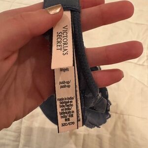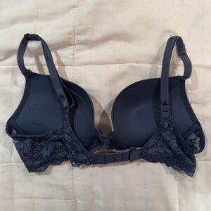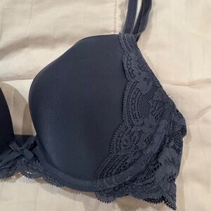 No longer sold, navy/midnight blue color, lace detailing on sides of bra and on band, small bow in center of bra, soft, great condition, no flaws