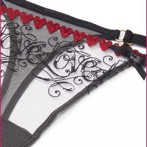 Comes with both panties size XXL and bustier size 38D. Brand new. Sold out. Faux leather details on each piece and embroidered hearts and writing.