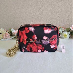 Victoria's Secret Crossbody Bag, black with red rose pattern, on front, back & sides, gold chain, zipper closure, logo in gold on front, black interior