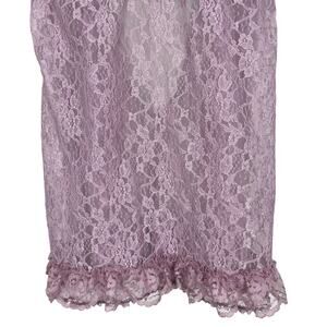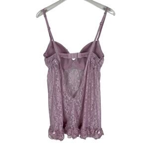 Floral lace babydoll lingerie top chemise. Ruffle detail to adjustable spaghetti straps, ruffle trim detail to hem. Back hook-and-eye closure. Lightly padded cups. Purple. Size 36C.