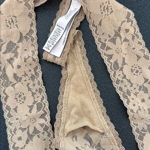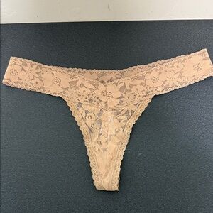Elegant lace thong panty in a nude shade. Perfect for a seamless look.