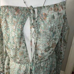 Elegant floral dress with lace-up detail. Off-shoulder style. Perfect for a chic look.