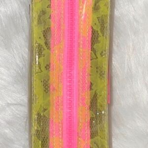 Elegant cosmetic case with yellow floral lace overlay. Ideal for storing beauty essentials.