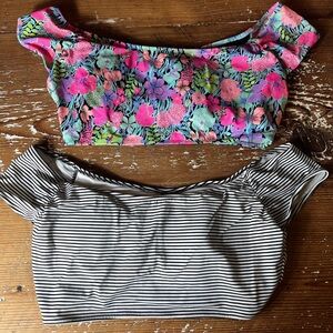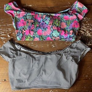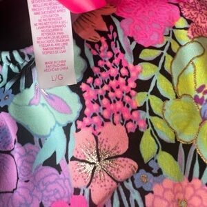 Vibrant floral tank top with pink, purple, and green hues. Classic black and white striped tank top. Stylish and versatile.