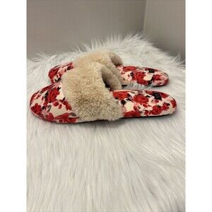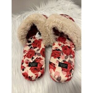Victoria's Secret Fur Floral Rose Striped SATIN Soft Bedroom Slippers Slides L