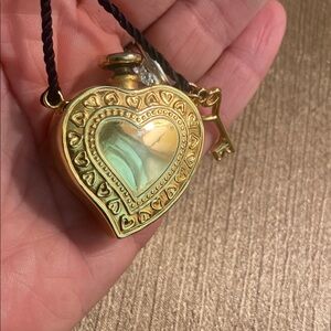 Chic gold heart locket with intricate key charm. Adds elegance to any look. The little secretion lid reveals a perfume flask for your favorite scent!