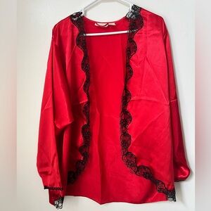 Victoria's Secret Gold Label Vintage Red Satin Black Lace Robe & Chemise Set