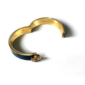 This Victoria's Secret hinged bangle features a gold-tone finish with vibrant green and blue enamel detailing. A central crystal accent adds a touch of sparkle. Hinged opening accommodates most wrists. Very good pre-owned condition. As a pre-owned item, this bangle may have light scuffing. See photos for more details.