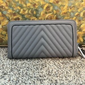 Elegant gray quilted wallet for women, perfect for everyday use. A great Victoria’s Secret clutch wallet. V detailing, brand new with tags and foam protective filling. Zippers run smoothly. Never used. Approximately 7” long, 4” tall, 1” wide unfilled. 12 spots for cards, 2 pockets behind the card slots for cash or other paper goods. Zipper pouch for cash, change, etc. I love offers!
