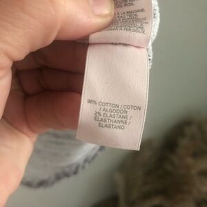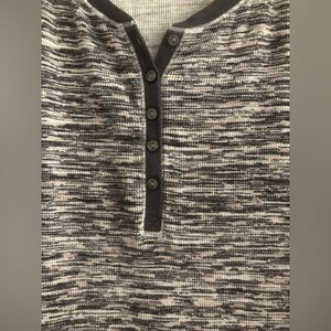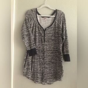 V-neck, button front gray and white top. Long, tunic length. Wear it as a sleep shirt? Pair it with jeans? Either way it’s soft, cozy and cute!
