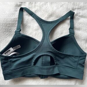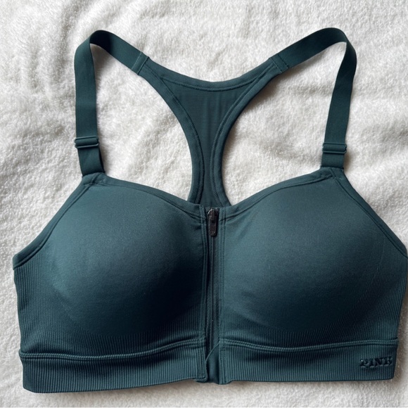 This sports bra from Victoria's Secret offers a seamless silhouette with its molded cups and lightly padded design. Crafted in a rich green hue, it features a racerback style for added support and comfort, making it ideal for both athletic activities and everyday wear.