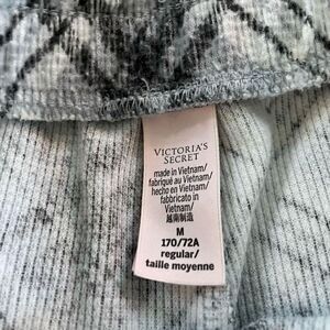 Women’s Victorias secret, cozy pajama set featuring three button Henley top and pull on jogger pants. Nubby textured thermal gray plaid. Laying flat the top measures 21.5 inches shoulder to ham and 21 inches armpit to armpit. Logo VS embroidered at the back neck. The elastic and drawstring pants measure 15 inches straight across the waist with a 12 inch rise and 27 inch inseam. Polyester and viscose blend.