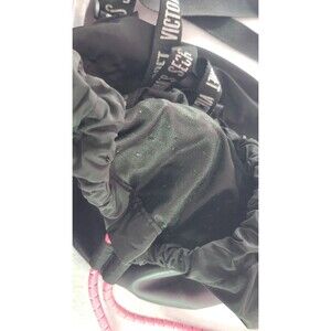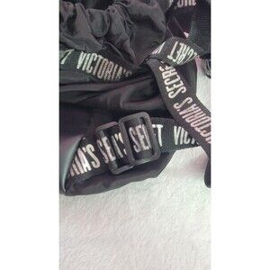 This item is in fair condition. It has several cosmetic flaws. The large "Victoria's Secret" lettering on the front of the bag is no longer present; the repeating text on the black shoulder straps shows noticeable fading and wear; there is a visible scuff and a small crack on the faux leather bottom (see close-up photos); and the black fabric body has light wrinkles and minor surface marks consistent with a pre-owned item.