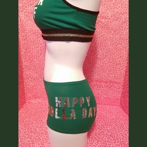 Victorias Secret Holiday Yoga Bra & Panty. The bra says "Jingle Your Bells Off" amd has a gold, glittery band. The panty says "Happy Holladays" and are boyshorts. Bra is not size L and Panty is M
