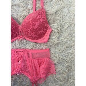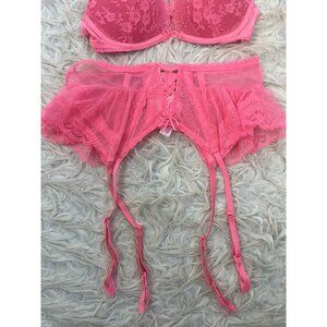 Victorias Secret Hot Pink Unlined Demi Underwire Push Up Bra 32B & Garter XS/S