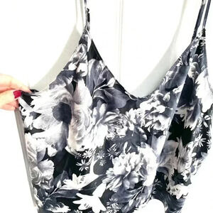2000’s flowy silky-feeling cami tank top with adjustable straps. Pretty black, white and gray floral.