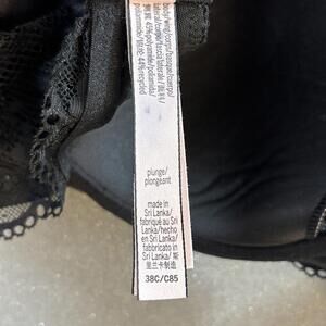 The Victoria's Secret Lace Bra in black, size 38C, is a semi-sheer lined Balconette Bra with a floral lace accent. This underwired bra boasts a hook and eye closure, lined interior, and bra strap style. Made from a blended fabric of nylon and lace, this classic Victoria's Secret bra from the Body by Victoria line is recommended for hand wash care only. The size and style cater to women looking for a comfortable yet stylish intimate wear option.light wear no flaws noted