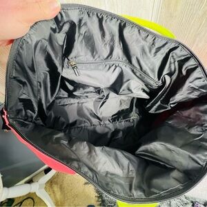 Canvas Overnight Travel Bag. Colorful Hot pink with Lime Green 10” Drop Handles and Crisp Black and White Stripes. Outside Slip in Pocket, Inside Zip Pocket. Adjustable Over the Shoulder Strap. Approx measurements at bottom 20.5” wide X 8”, 16” Tall. NWT🚭