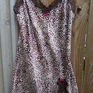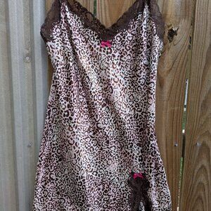 Pink toned Leopard print Teddy slip dress with brown lace and pink bow detailsY2K Victoria's Secret